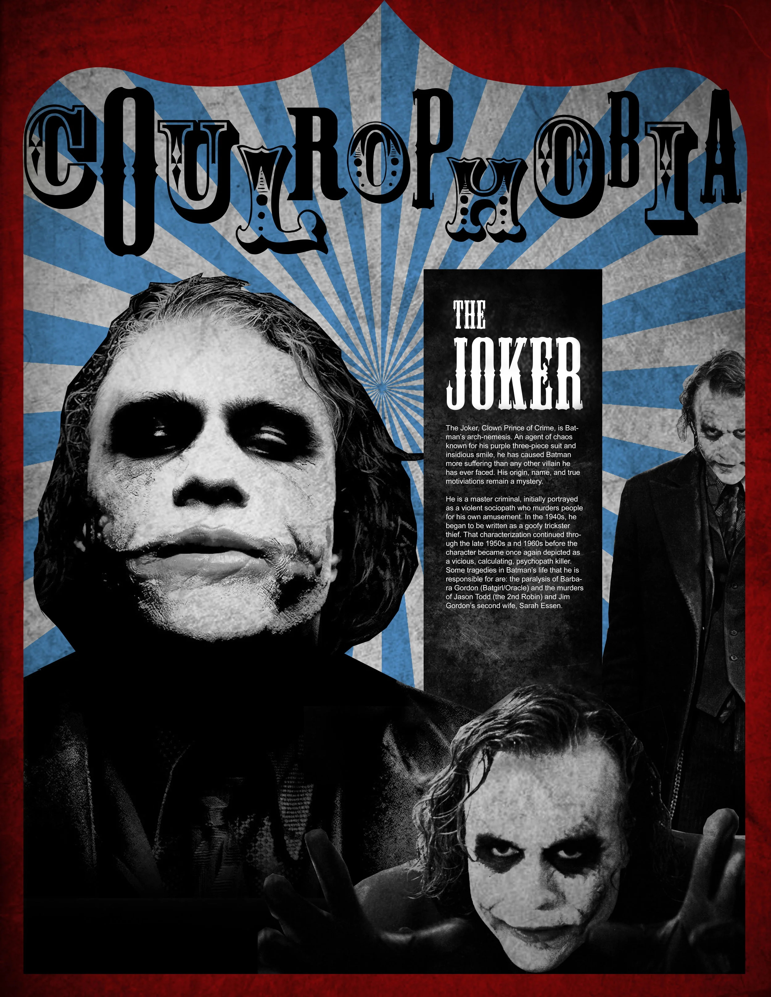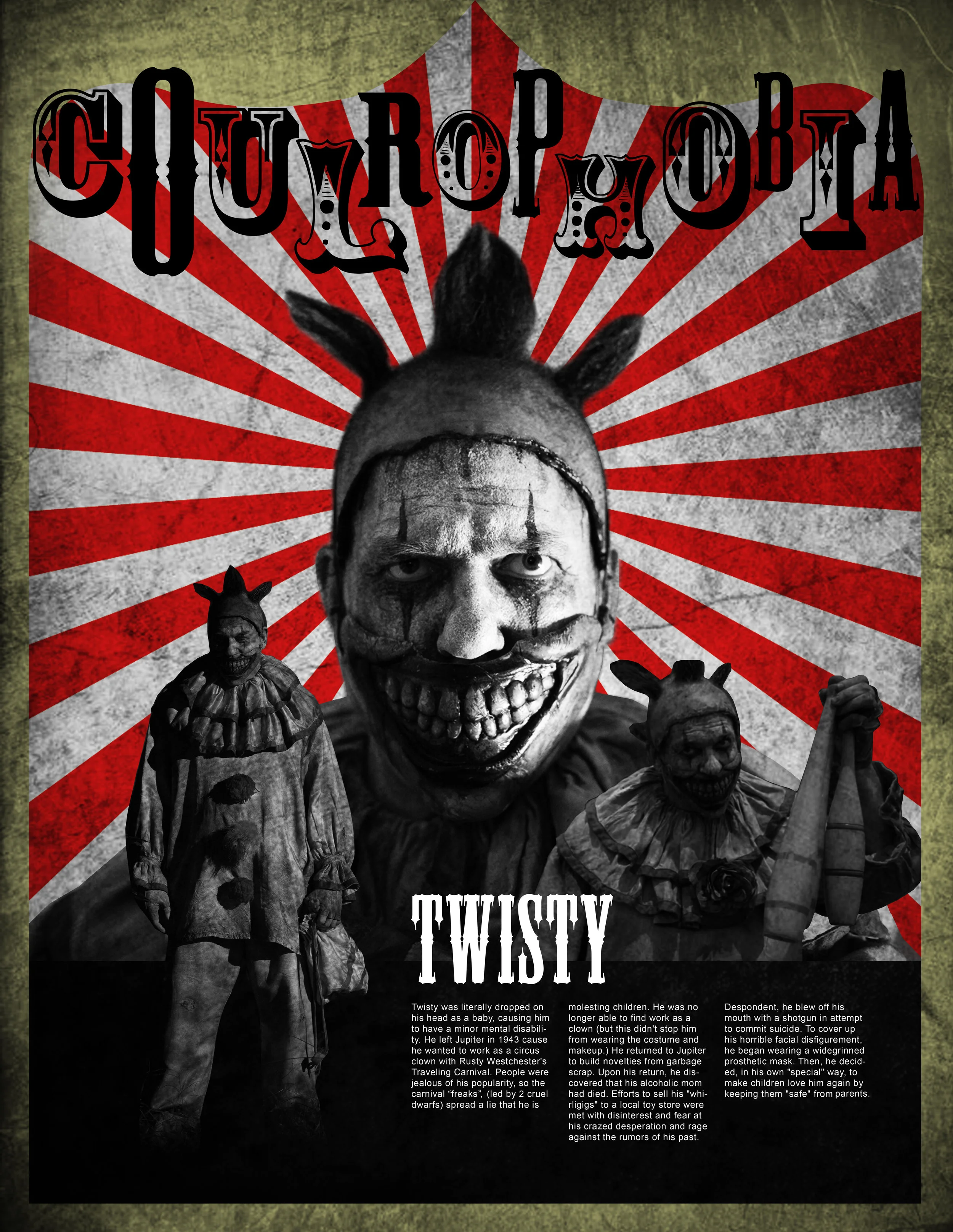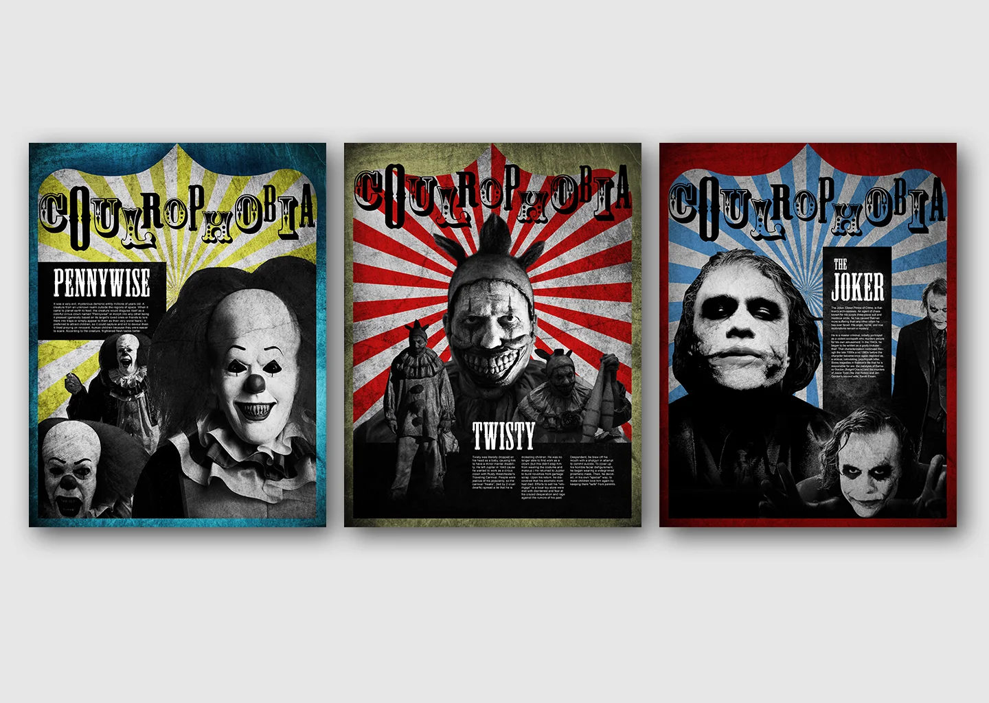 Coulrophobia is the fear of clowns. Below is a set of experimental posters